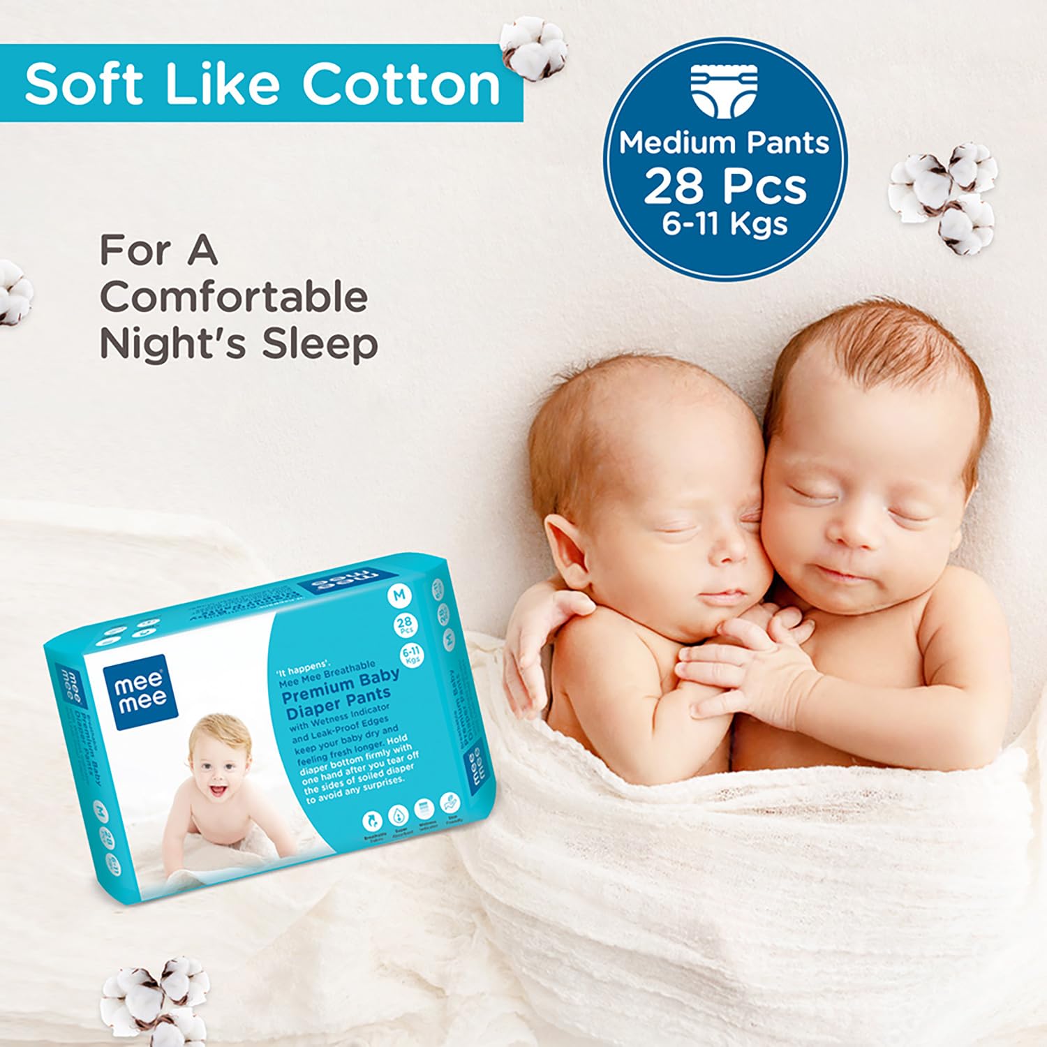 Mee Mee Premium Breathable Baby Diaper Pants, Medium, Pk of 28 For 6-11 Kgs | Fast Absorbing, Cotton Soft Feel with Wetness Indicator |Double Layer Leakage & Anti-Rash Shield Protection Up to 12 Hours