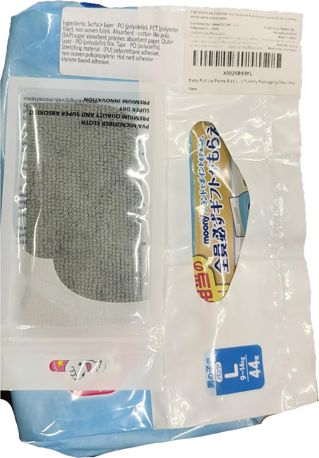 Size of disposable diaper pants: as you have seen from product pictures, there are many sizes available just in the Moony brand. As babies grow, their postures and skeletal structures change. Also, the amount of urine increases, and the state of the stools changes too. That’s why, as the size of the disposable pull-ups gets bigger, not only do the length and width increase but the dimensions and shape of the absorber change too.